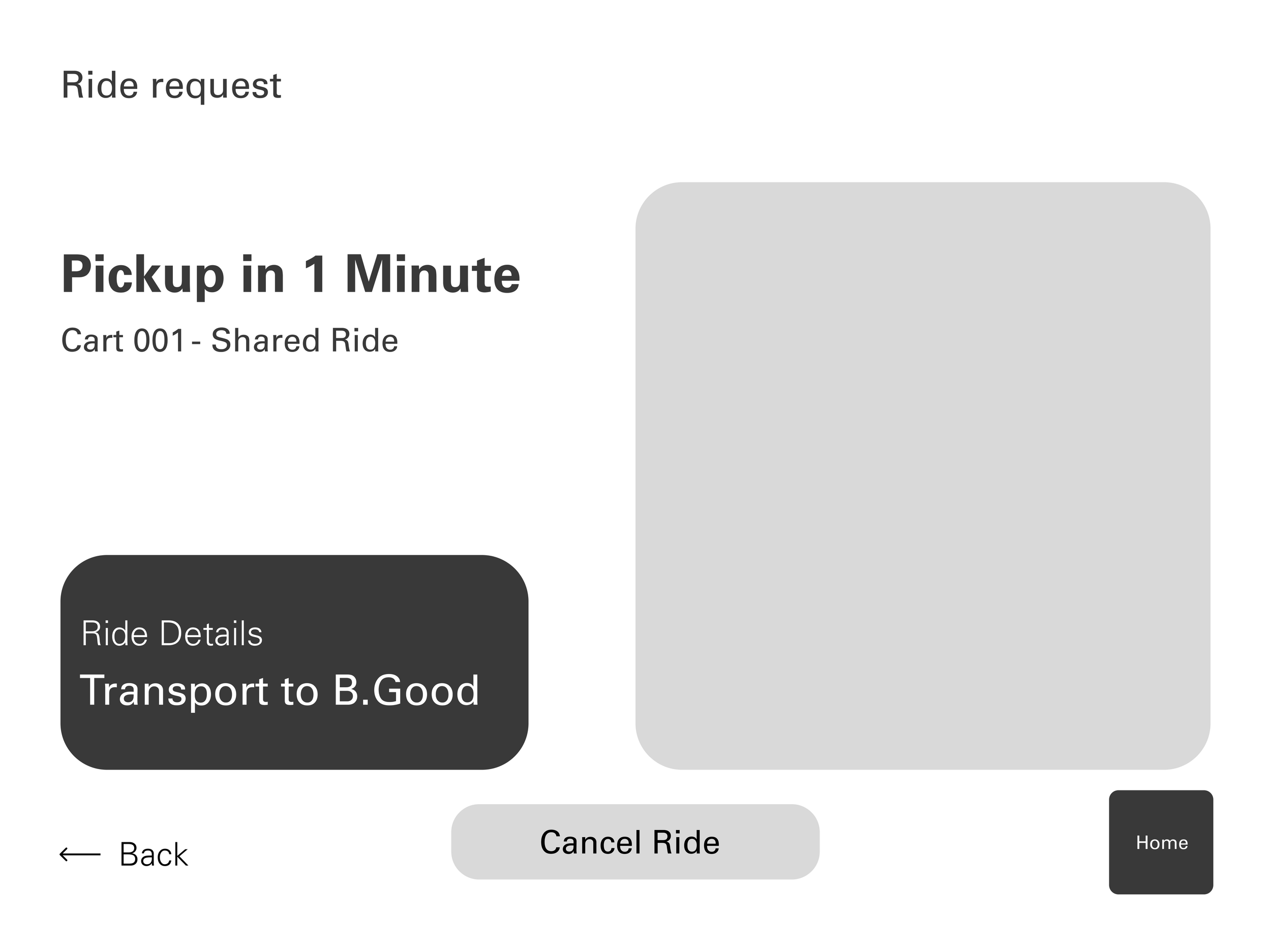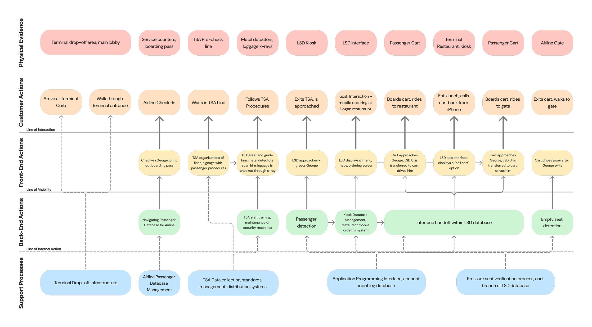 Our initial idea was to have a one-stop user interface designed for passengers to be able to seek help, navigate the airport and access flight information independently. The interface would be displayed at kiosks as well as on the user’s mobile device. Features would include a map of the airport, flight information, request of a personal cart, assistance, and an FAQ page. Another team member sketched out the homepage design, which I then expanded upon digitally. I mapped out the familiar journey of George requesting a cart to take him to lunch.