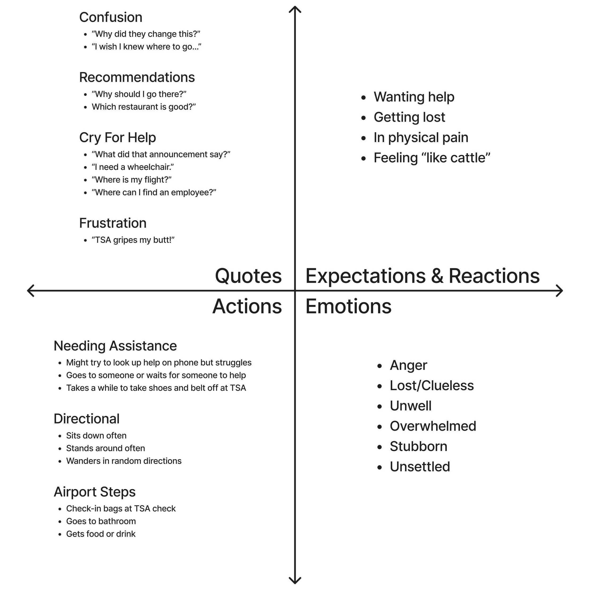 For user interviews, we turned to our grandparents and had them share their experiences navigating airports with us. Throughout the three interviews overall came mixed feelings towards the curb-to-gate experience. While certain aspects such as clear signage and helpful staff were appreciated, TSA procedures, being in physical pain and a commonly chaotic environment consistently emerged as pain points.